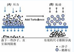 (A)對(duì)混合物施加直接的壓力,使得底部砂粒落下;在篩網(wǎng)表面形成一個(gè)鵝卵石層,阻礙頂部砂粒向篩網(wǎng)方向移動(dòng)并通過篩網(wǎng)。(B)振動(dòng)篩網(wǎng),破壞位于混合物底部的積聚鵝卵石層,使完全分離得以進(jìn)行;切向流過濾中,進(jìn)科流的錯(cuò)流動(dòng)力學(xué)作用,就相當(dāng)于此例中的振動(dòng)。