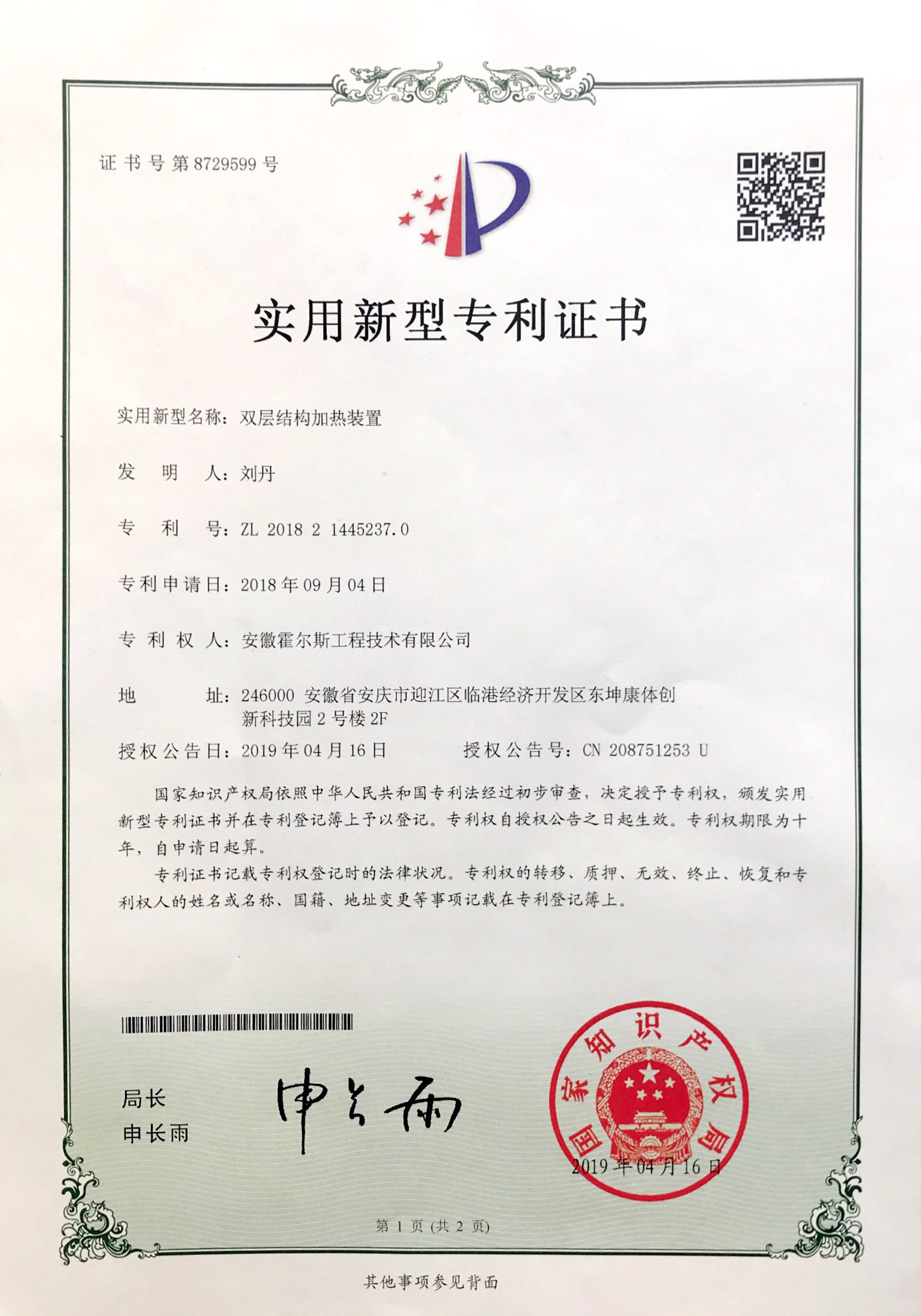 霍爾斯中試型噴霧干燥機雙層結(jié)構(gòu)加熱裝置榮獲國家專利證書